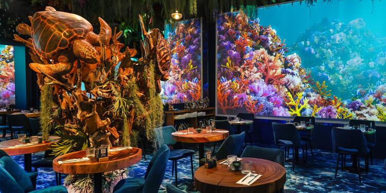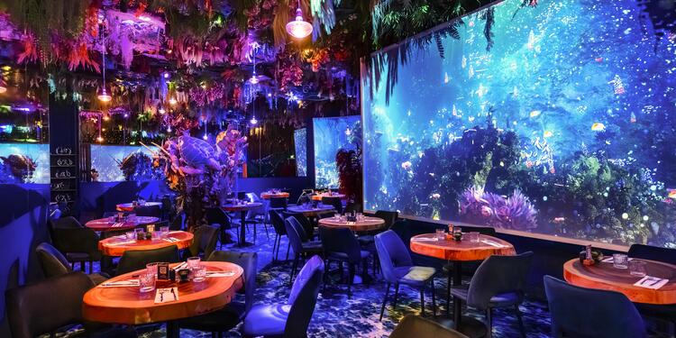 Under The Sea by Ephemera- Montpellier se distingue par son concept immersif unique qui vous plonge au cœur de l'océan grâce à des projections 4K spectaculaires et un décor à 360°. Ce restaurant méditerranéen travaille exclusivement avec des produits frais et de saison pour vous proposer des spécialités faites maison. À la carte, vous retrouverez le tataki de thon rouge aux accents méditerranéens, les pâtes à la homardine, le gravlax de daurade ou encore le Sea Burger au lieu en tempura. L'établissement propose également des cocktails signature comme l'Atlantis Punch ou le Spritz des Abysses, ainsi qu'un menu immersif complet entrée-plat-dessert. Des options végétariennes sont disponibles pour tous vos convives.